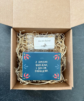 Zate smo pripravili darilni paket Najboljša sodelavka, v katerem so same uporabne, okusne in prikupne zadeve. Ne tiste, katere odložimo ko jih dobimo in se na njih nabira prah, ampak tiste, ki pogrejejo srce, razvjajajo borbončice in razveselijo dušo ❤️