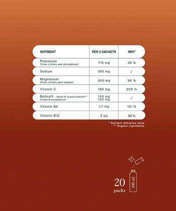 Regulator kislosti (citronska kislina), magnezijev citrat, natrijev klorid, kalijev citrat, monokalijev fosfat, naravne arome, magnezijev malat, vitamin C (L-askorbinska kislina), koncentrat barvila iz rdeče pese, Belinal (ekstrakt vejice srebrnega smreke – Abies alba), sladilo (sukraloza), vitamin B6 (piridoksin hidroklorid), vitamin B12 (cianokobalamin).