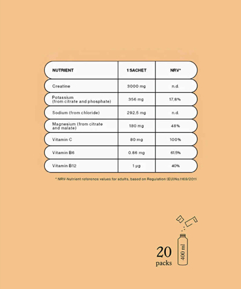 Vsaka doza vsebuje 3 g kreatin monohidrata skupaj z bistvenimi elektroliti, ki pomagajo pri: